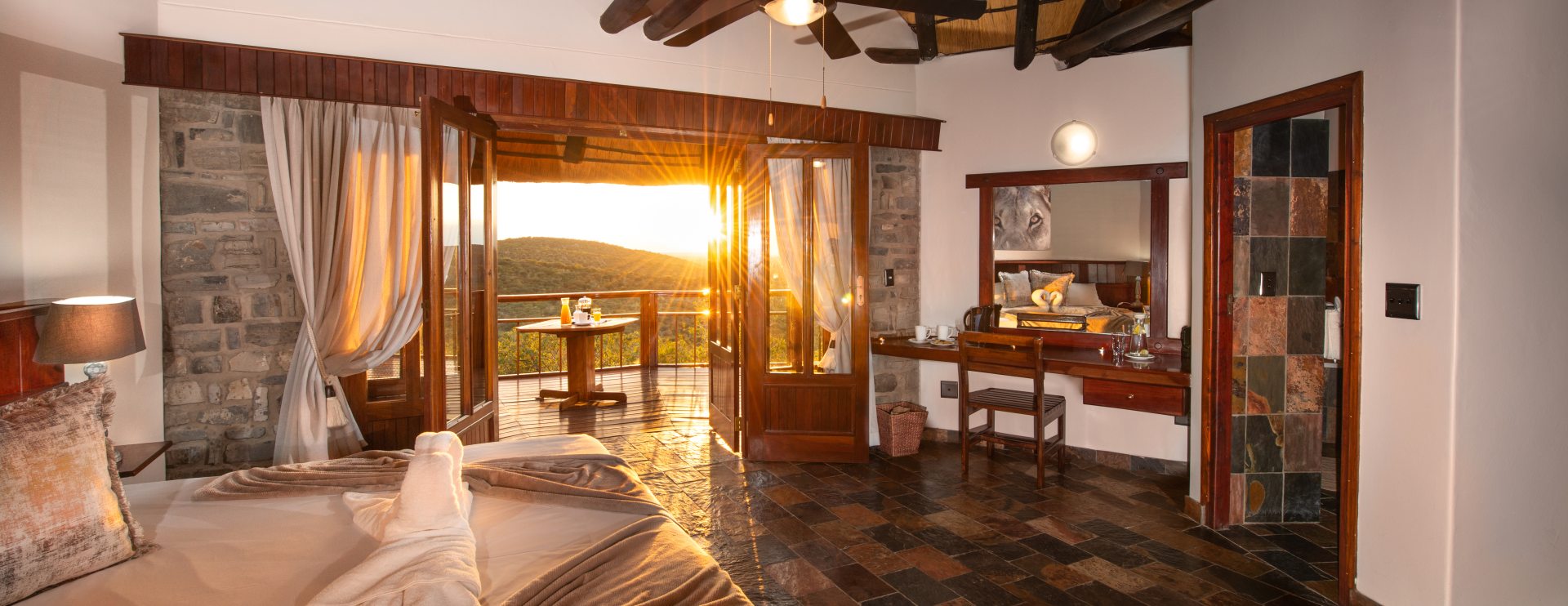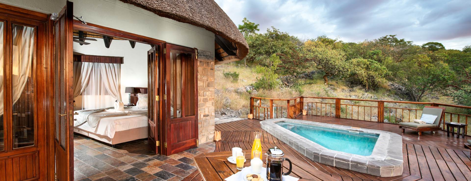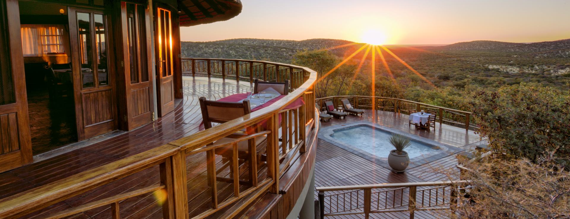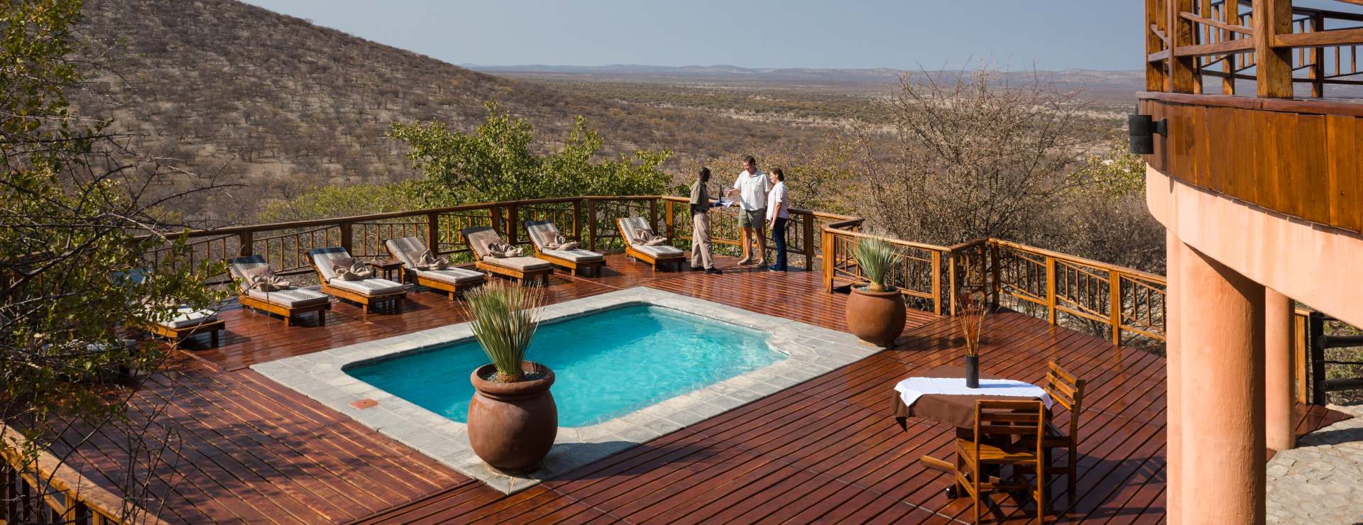 Etosha Mountain Lodge er en lille eksklusiv safari-lodge med kun 9 hytter. Hver hytte har en-suite badeværelse, komfortable senge (twin eller king-size), aircondition, loftsventilator og privat terrasse, og nogle har egen plunge pool. Fra lodgen kan I observere dyrelivet, herunder elefanter, næsehorn, løver, leoparder og geparder, enten på guidede safarier, natsafarier eller direkte fra lodgens vandhul.