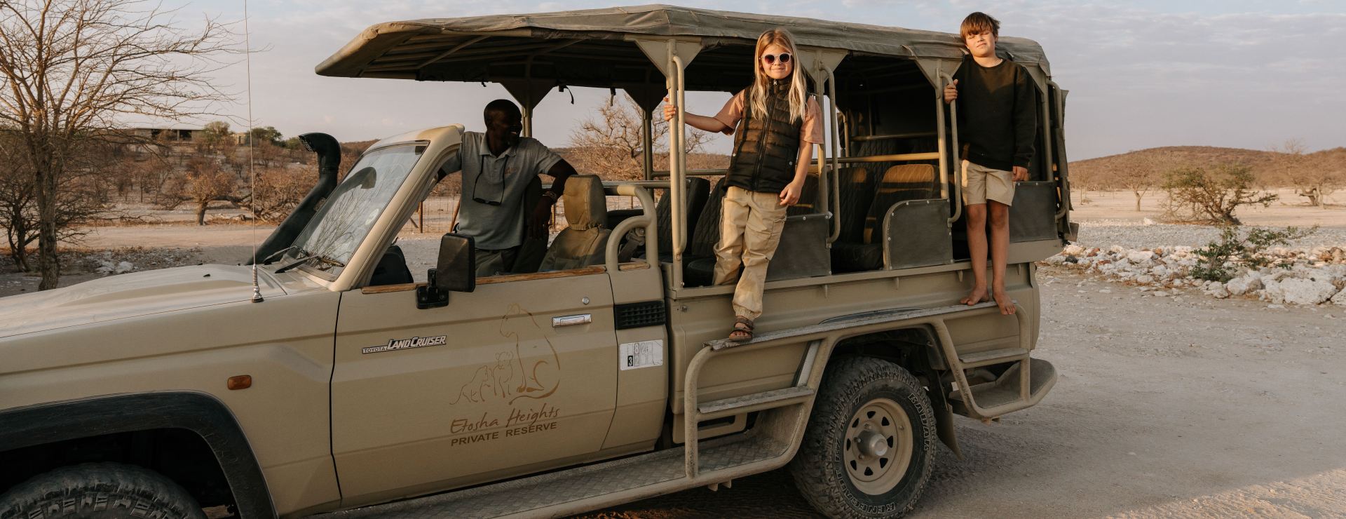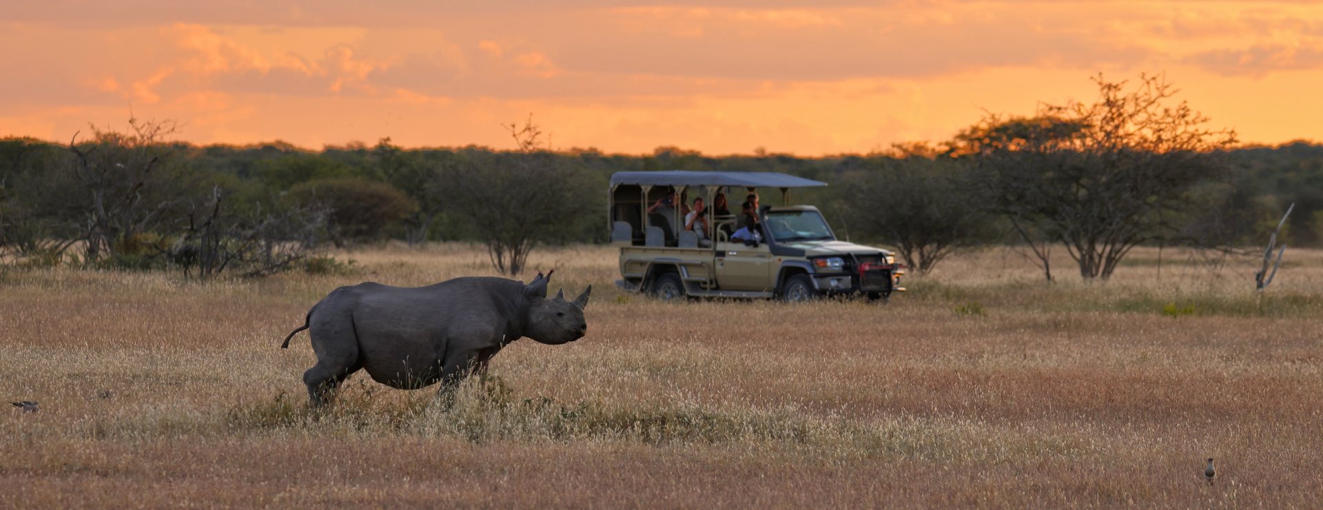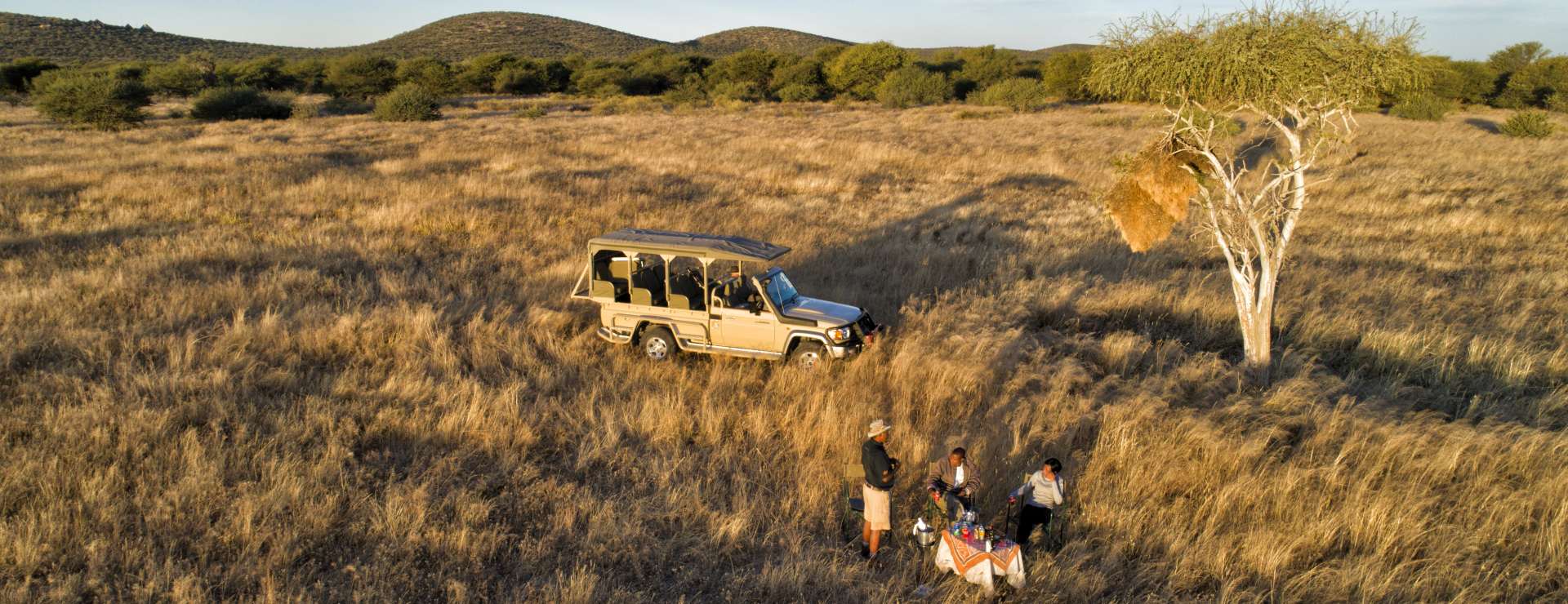 Din dag starter med solopgang over bushen, mens I nyder kaffe eller te på jeres terrasse. Efter morgenmaden tager I på jeres morgensafari, hvor I kan opleve elefanter, næsehorn, løver, leoparder og andre afrikanske dyr. I er tilbage på lodgen inden frokosten, og herefter er der tid til at slappe af inden jeres eftermiddagssafari aktivitet. Om eftermiddagen kan I tage på safari i Etosha Nationalpark for at opleve de mange vandhuller med dyreliv og den enorme den saltslette. Eller kan tage safarien I jeres private område, hvor I så kan have den klassiske safarioplevelse med solnedgangsstop med dyrelivet i baggrunden og den spektakulære solnedgang. Herefter kører i tilbage til lodgen i mørke. Det er også en oplevelse. I spiser middag i lodgens restaurant, inden I trækker jer tilbage til jeres hytte.