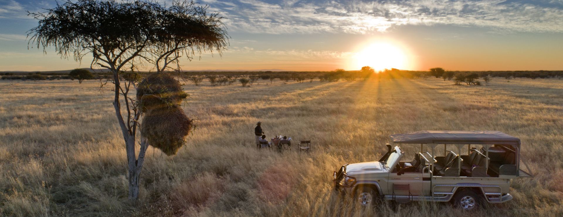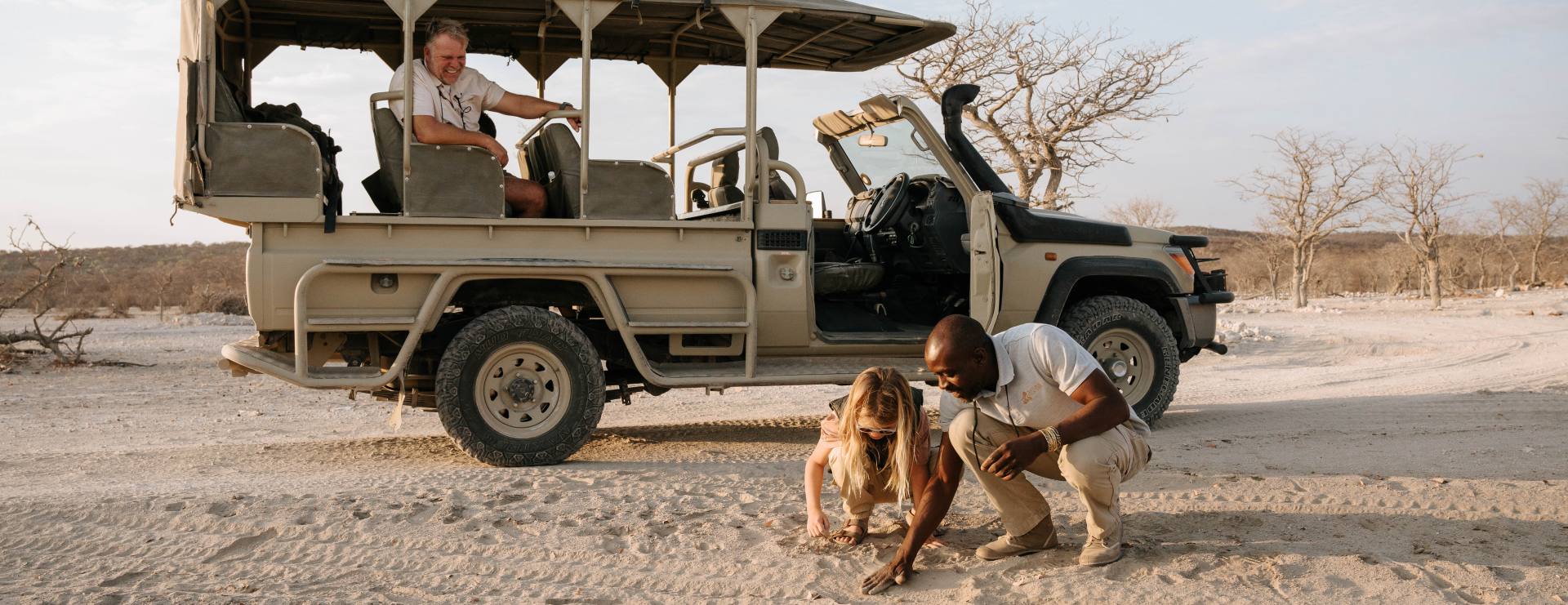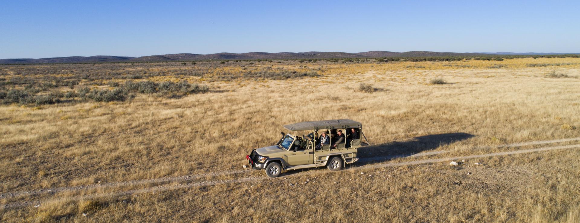 Din dag starter med solopgang over bushen, mens I nyder kaffe eller te på jeres terrasse. Efter morgenmaden tager I på jeres morgensafari, hvor I kan opleve elefanter, næsehorn, løver, leoparder og andre afrikanske dyr. I er tilbage på lodgen inden frokosten, og herefter er der tid til at slappe af inden jeres eftermiddagssafari aktivitet. Om eftermiddagen kan I tage på safari i Etosha Nationalpark for at opleve de mange vandhuller med dyreliv og den enorme den saltslette. Eller kan tage safarien I jeres private område, hvor I så kan have den klassiske safarioplevelse med solnedgangsstop med dyrelivet i baggrunden og den spektakulære solnedgang. Herefter kører i tilbage til lodgen i mørke. Det er også en oplevelse. I spiser middag i lodgens restaurant, inden I trækker jer tilbage til jeres hytte.