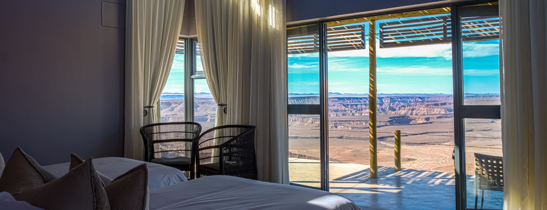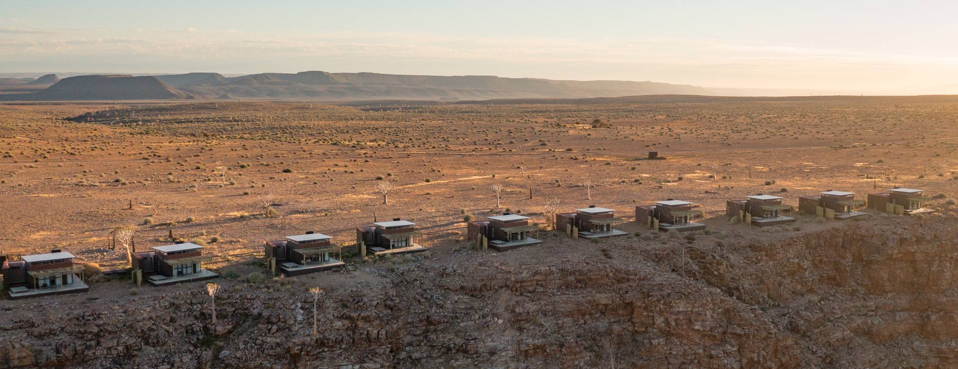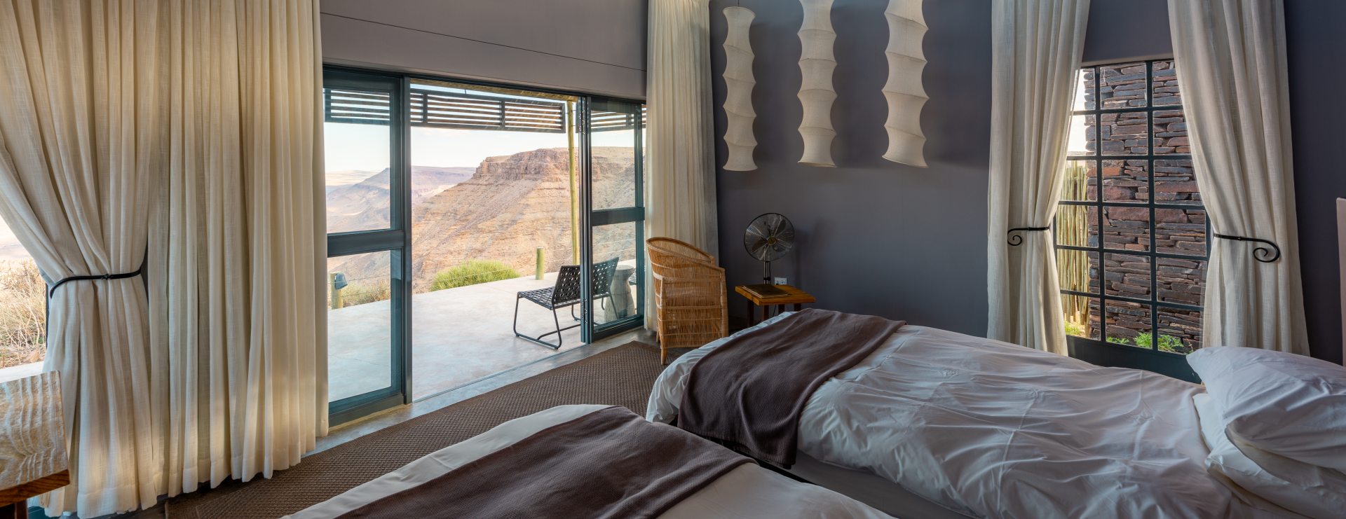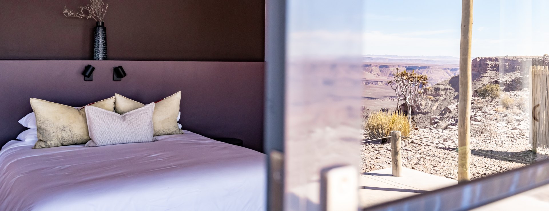I vågner til solopgangen, der farver Fish River Canyon i røde og gyldne nuancer, mens I kan nyde udsigten direkte fra sengen gennem de store vinduer. Derefter serveres en buffetmorgenmad med frisk frugt, brød, æg og kaffe på terrassen. Om morgenen kan I tage på en guidet vandring langs kanten af kløften, hvor luften stadig er kølig, og chancen for at se dyreliv er størst. Til frokost serveres en let anretning som salater, tærter eller sandwiches, hvorefter de varmeste timer på dagen ofte bruges ved poolen, i skyggen med en bog eller på terrassen foran jeres hytte. Om eftermiddagen byder lodgen på te og hjemmebagt kage, og herefter kan I tage på en solnedgangstur, hvor en guide kører jer ud til et særligt udsigtspunkt. Her nydes en drink, mens solen går ned og farver himlen over kløften dramatisk. Tilbage på lodgen serveres en tre-retters middag i restauranten med retter baseret på friske, lokale råvarer. Aftenen afrundes i loungen med et glas vin foran pejsen under en stjerneklar himmel eller i foran jeres hytte, hvor stilheden fra ørkenen tager over – Godnat.