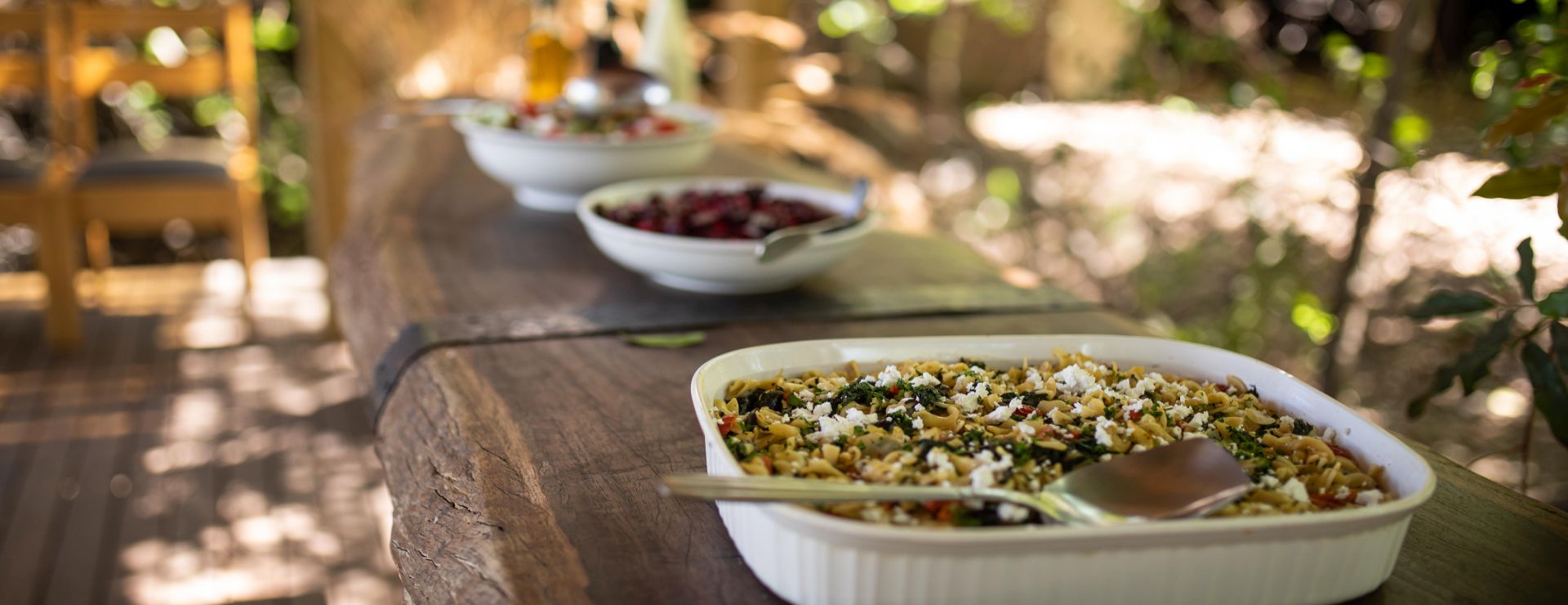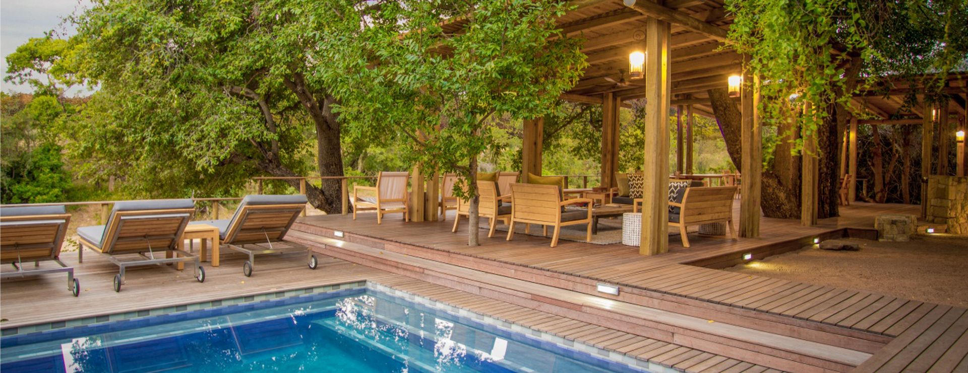 Fællesområderne omfatter en lounge med udsigt over en flodseng, en pool, bålplads og et overdækket spiseområde. Maden tilberedes med friske, lokale råvarer og serveres som fællesmåltider tit under åben himmel – ofte med klassisk sydafrikansk grillstemning.