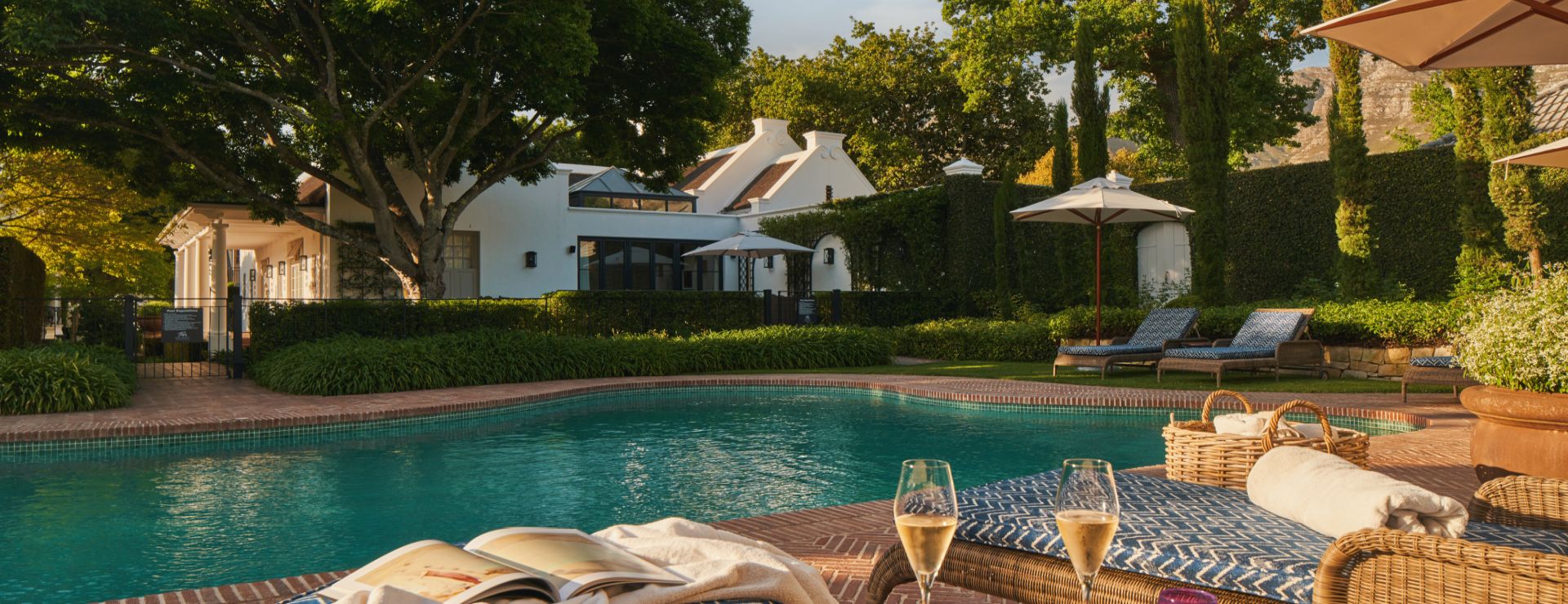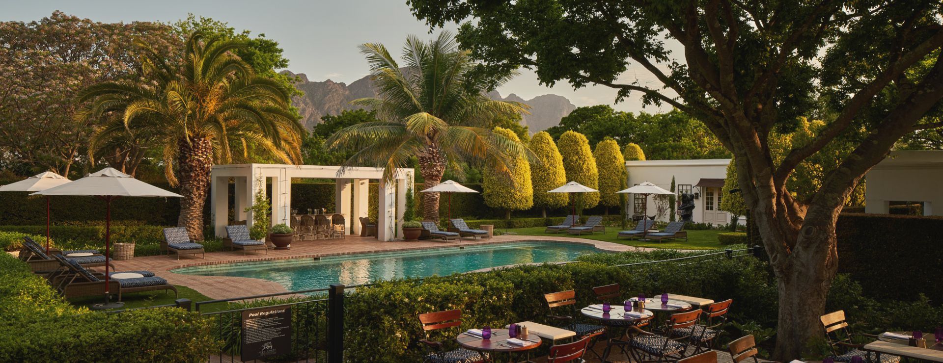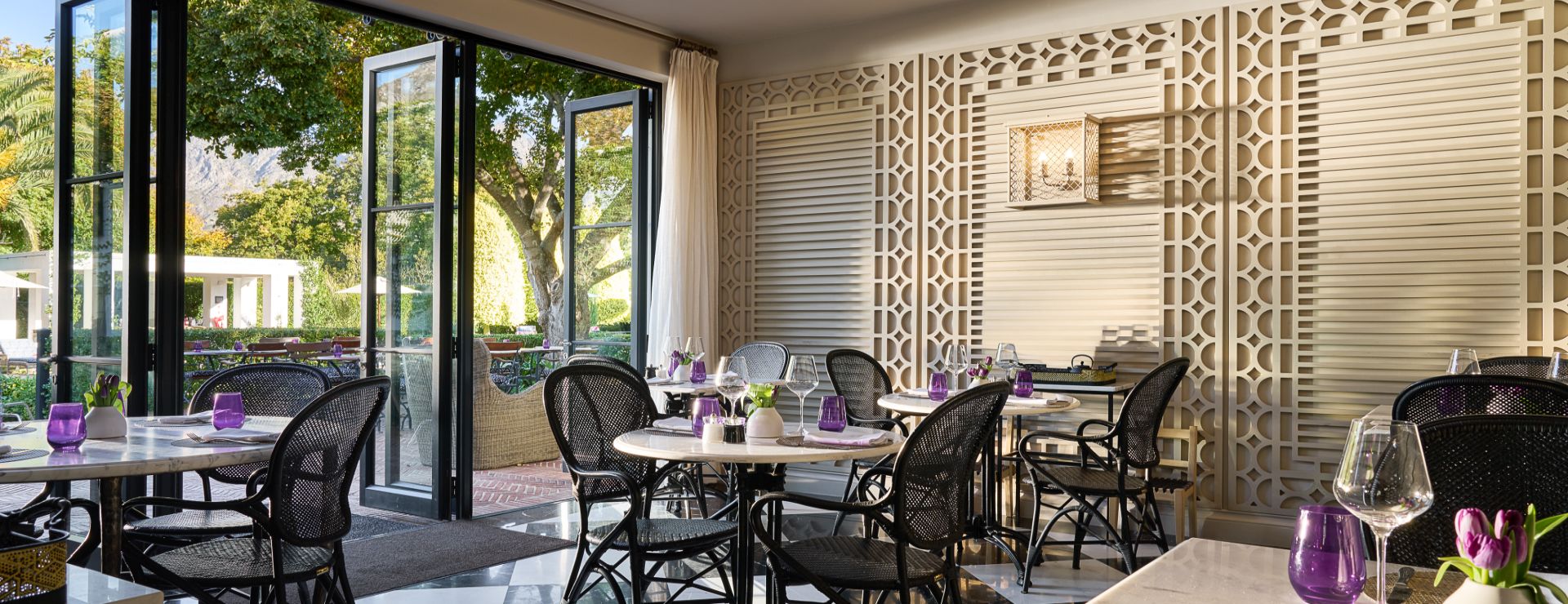 Hotellets fællesarealer er indbydende og afslappende. Den 15 meter lange udendørs pool er omgivet af frodige, tropiske haver med udsigt til bjergene, og spisning foregår i The Conservatory – en smuk spisestue med fokus på sæsonens lokale råvarer, hvor man både kan sidde inde og ude. I får desuden én eksklusiv vinsmagning inkluderet pr. ophold hos Great Heart Wine Boutique, der ligger på søsterhotellet Le Quartier Français, blot få skridt væk. Der tilbydes også gratis shuttle-service til Leeu Estates, hvor man kan nyde spa-behandlinger, kunstudstillinger og yderligere vinsmagninger i landlige omgivelser.