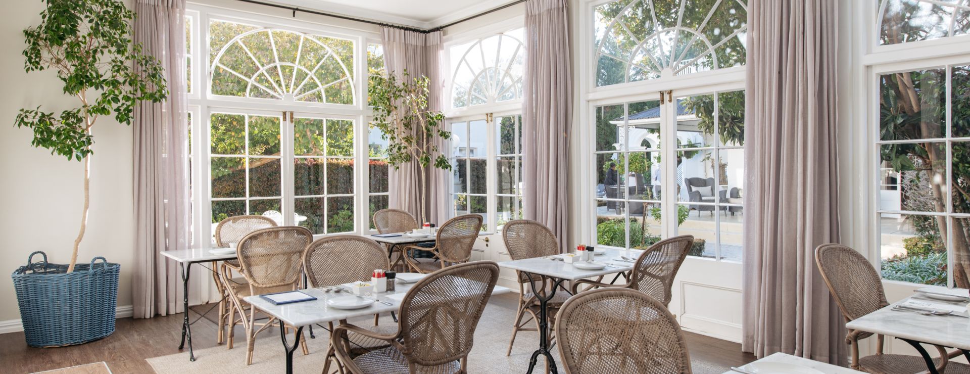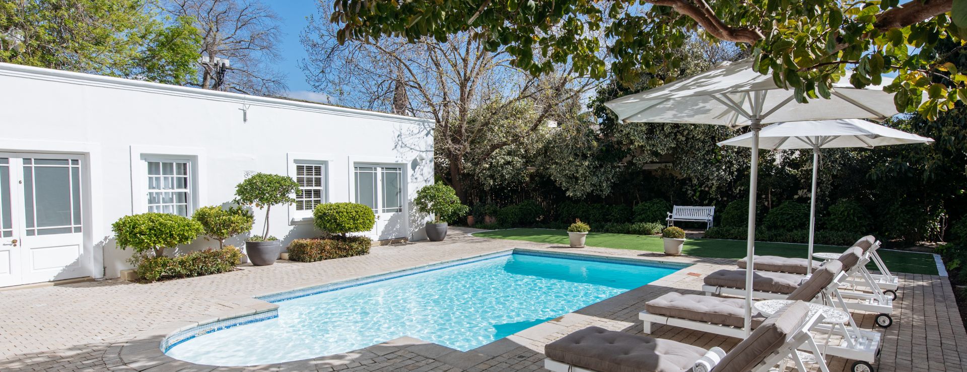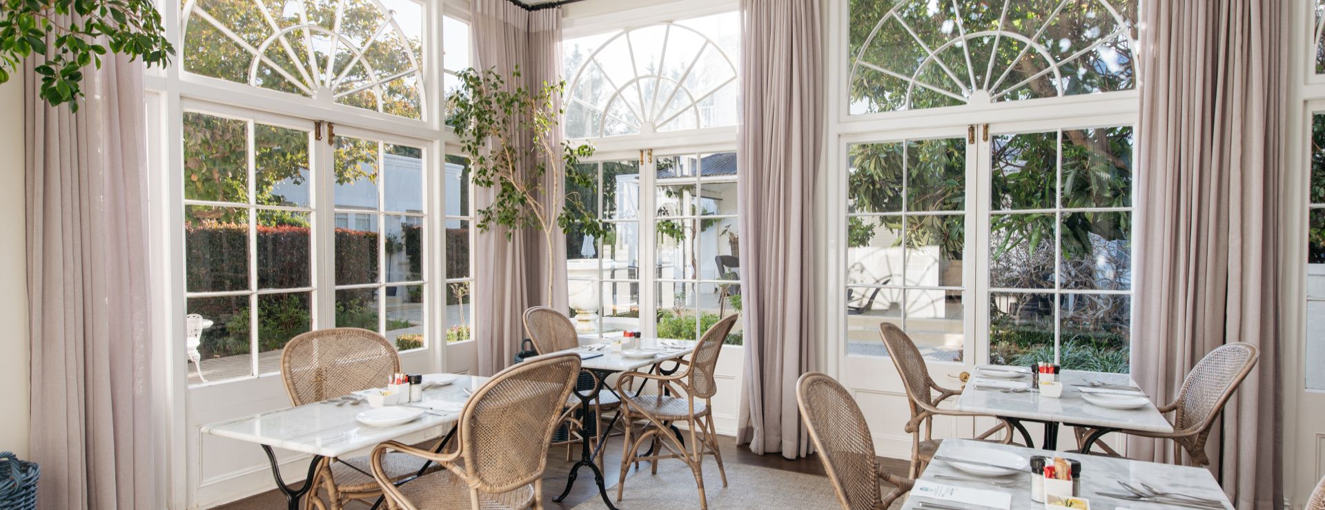 Inde i hovedbygningen er der flere fællesområder, herunder en klassisk lounge og et bibliotek med pejs. Om morgenen serveres der morgenmad enten på terrassen eller i haven – en kombination af buffet og à la carte-retter, altid med friske råvarer og et strejf af sydafrikansk smag. I løbet af dagen kan du bestille lette måltider og snacks, men ellers er der mange restaurantmuligheder i byen. I en afsides del af haven ligger hotellets lille spa, med behandlinger som massage og ansigtspleje.